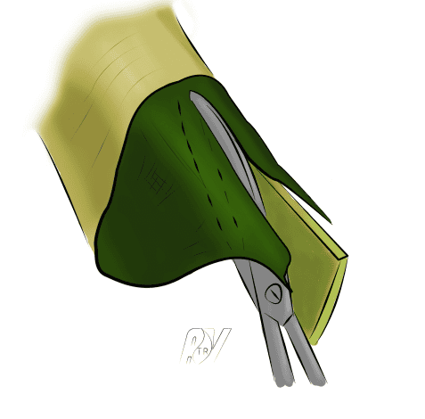 Par voie intercartilagineuse, on décolle la peau puis la muqueuse du cartilage de la crus latérale aux ciseaux courbes, de façon rétrograde, jusqu’aux repères cutanés tracés en début d’intervention. On résèque ensuite la bandelette supérieure à l’aide du bistouri et des ciseaux.