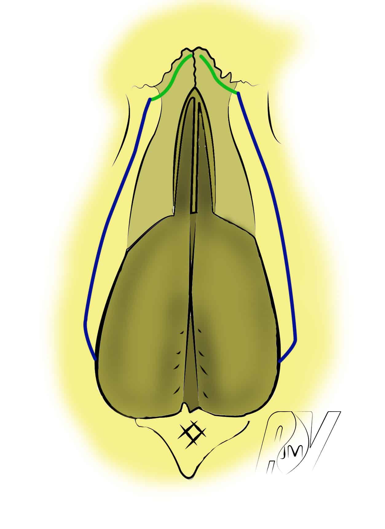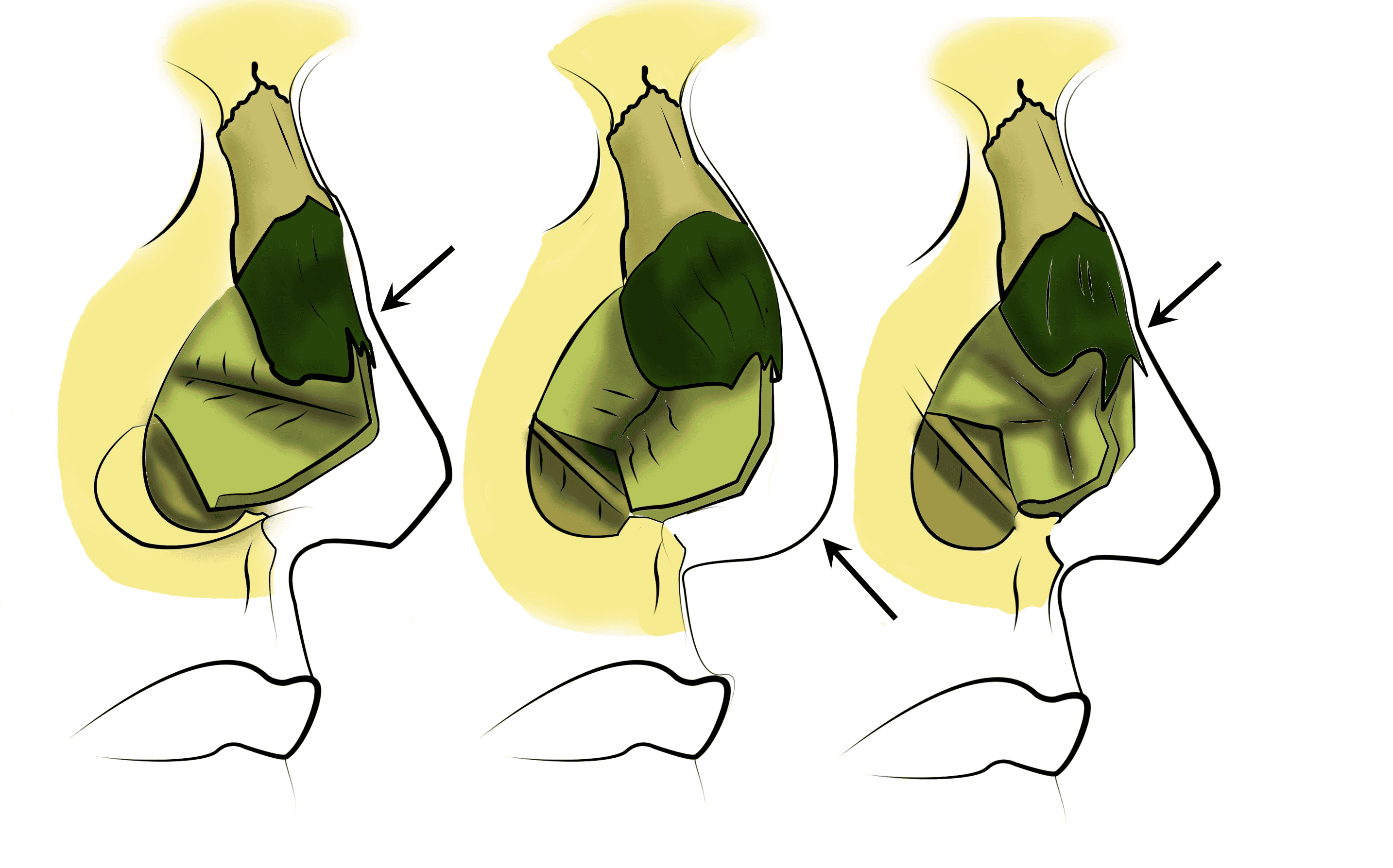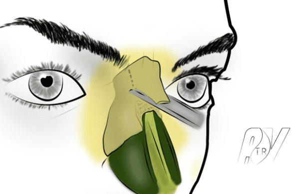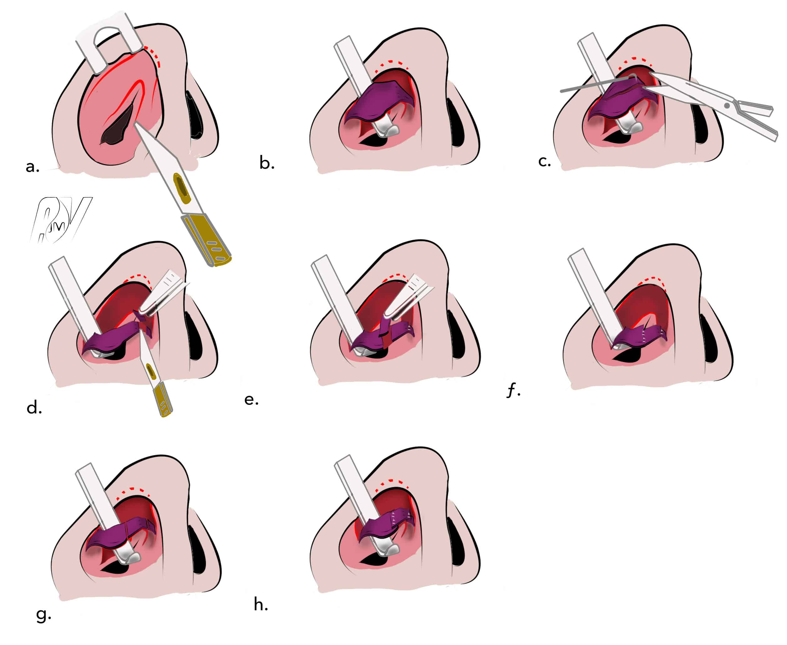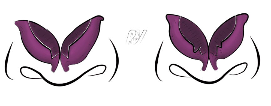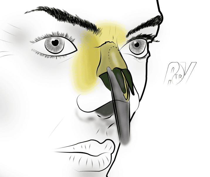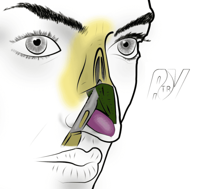 - Se prolongeant dans le seuil narinaire, juste en dehors du petit lobule marquant la base de la columelle. A ce niveau, l’incision doit déssiner une lègère courbe à convexité externe (Médial flap de Sheen).