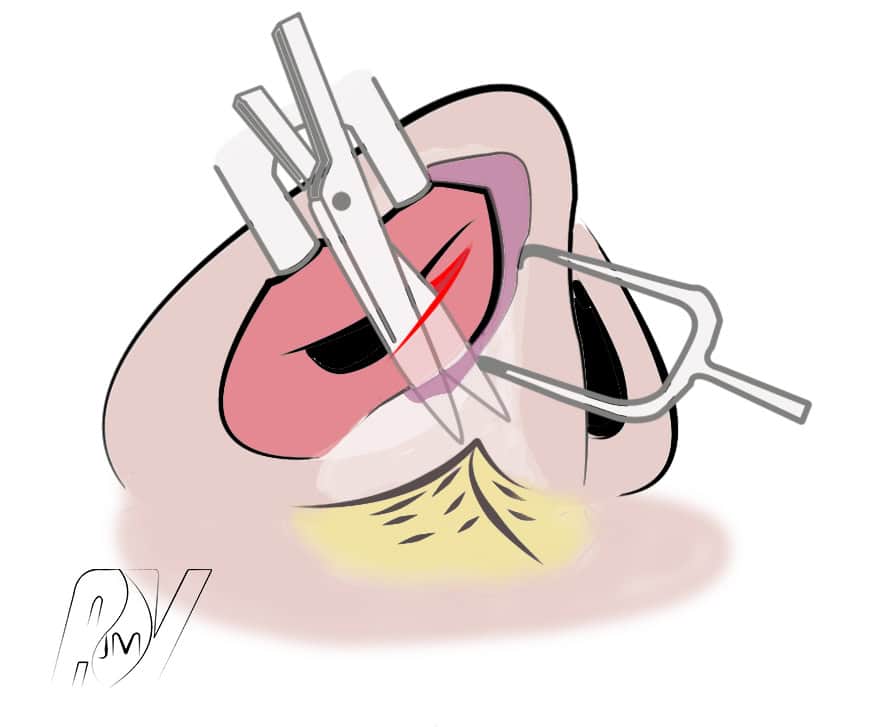 Par voie transcartilagineuse il suffit de pratiquer l’ablation du cartilage situé au dessus de l’incision.