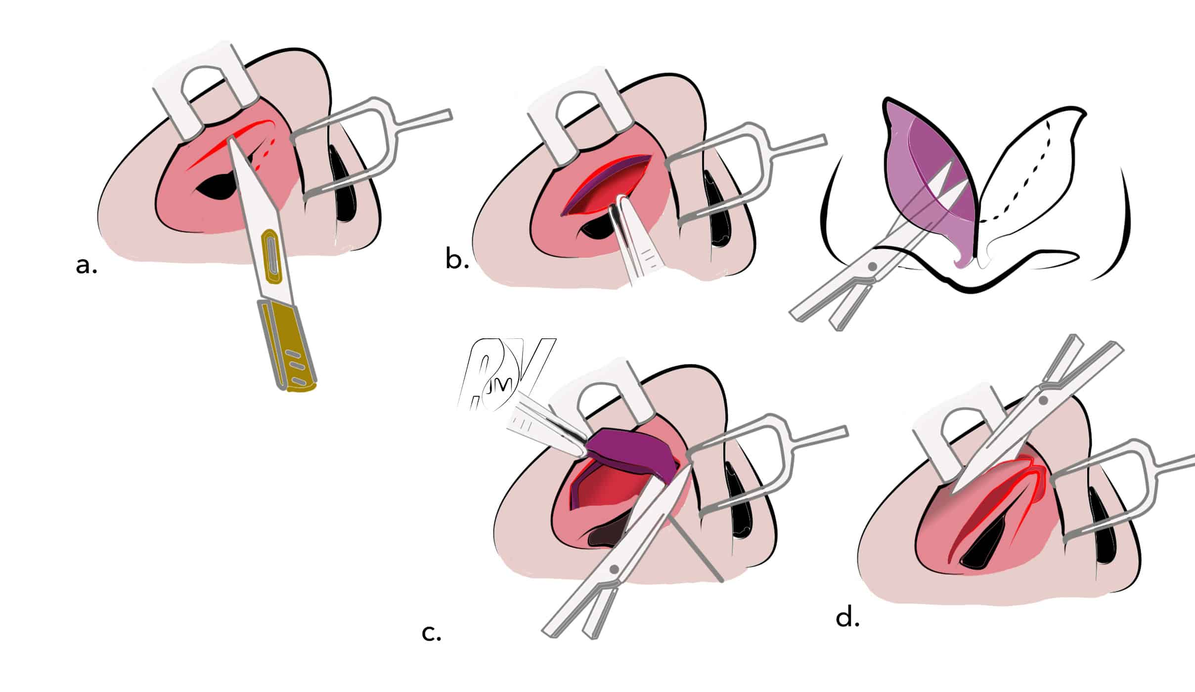 Section au bistouri du débord cutané au niveau de l’aile du nez, de l’ourlet narinaire et du plan muqueux interne si nécessaire.