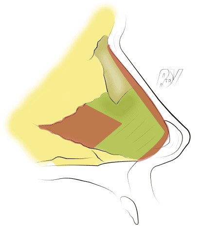 L’exérèse du bord caudal du septum permet très facilement de diminuer la projection de la pointe du nez. Ce temps est obligatoire afin de ne pas s’exposer à une résection de bosse trop généreuse. Il faut raccourcir le septum après avoir disséquer en sous périchondral, son bord caudal (zone de résection en rouge sur le schéma).