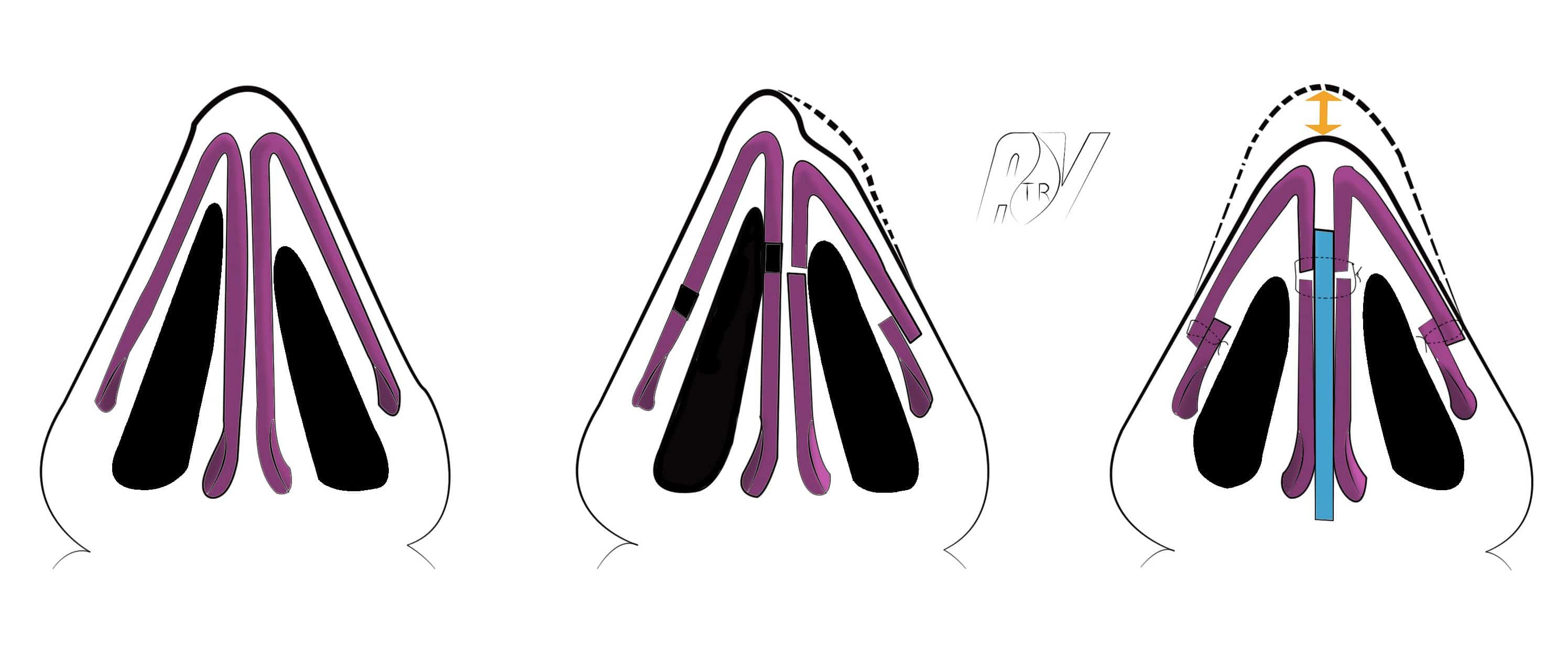 Si le septum nasal est trop court un greffon d’extension septal, fixé au septum résiduel, peut être mis en place avant la réalisation du « tongue in groove » .