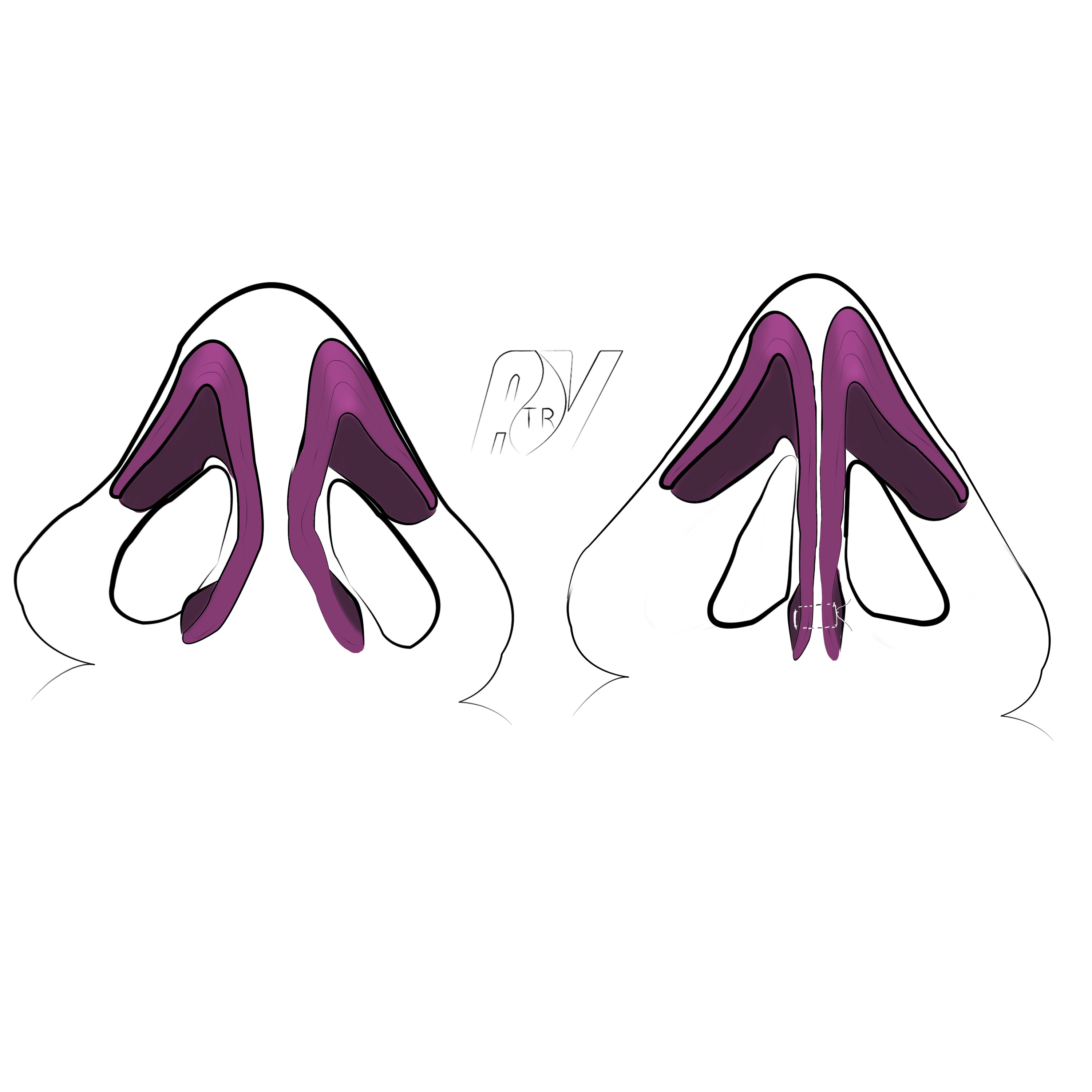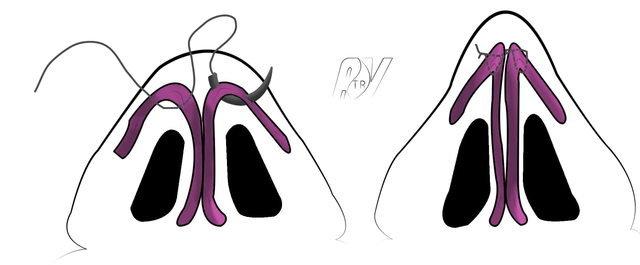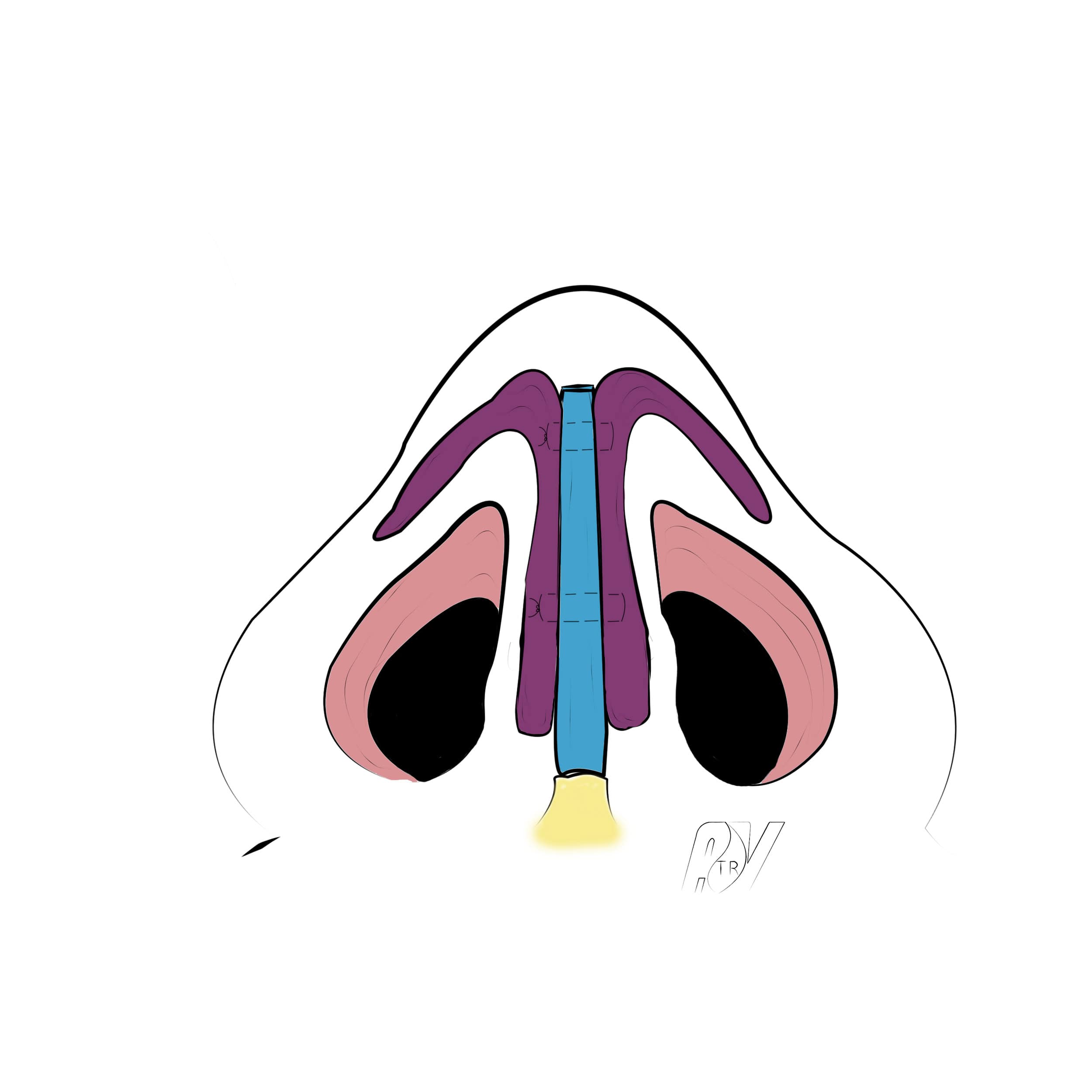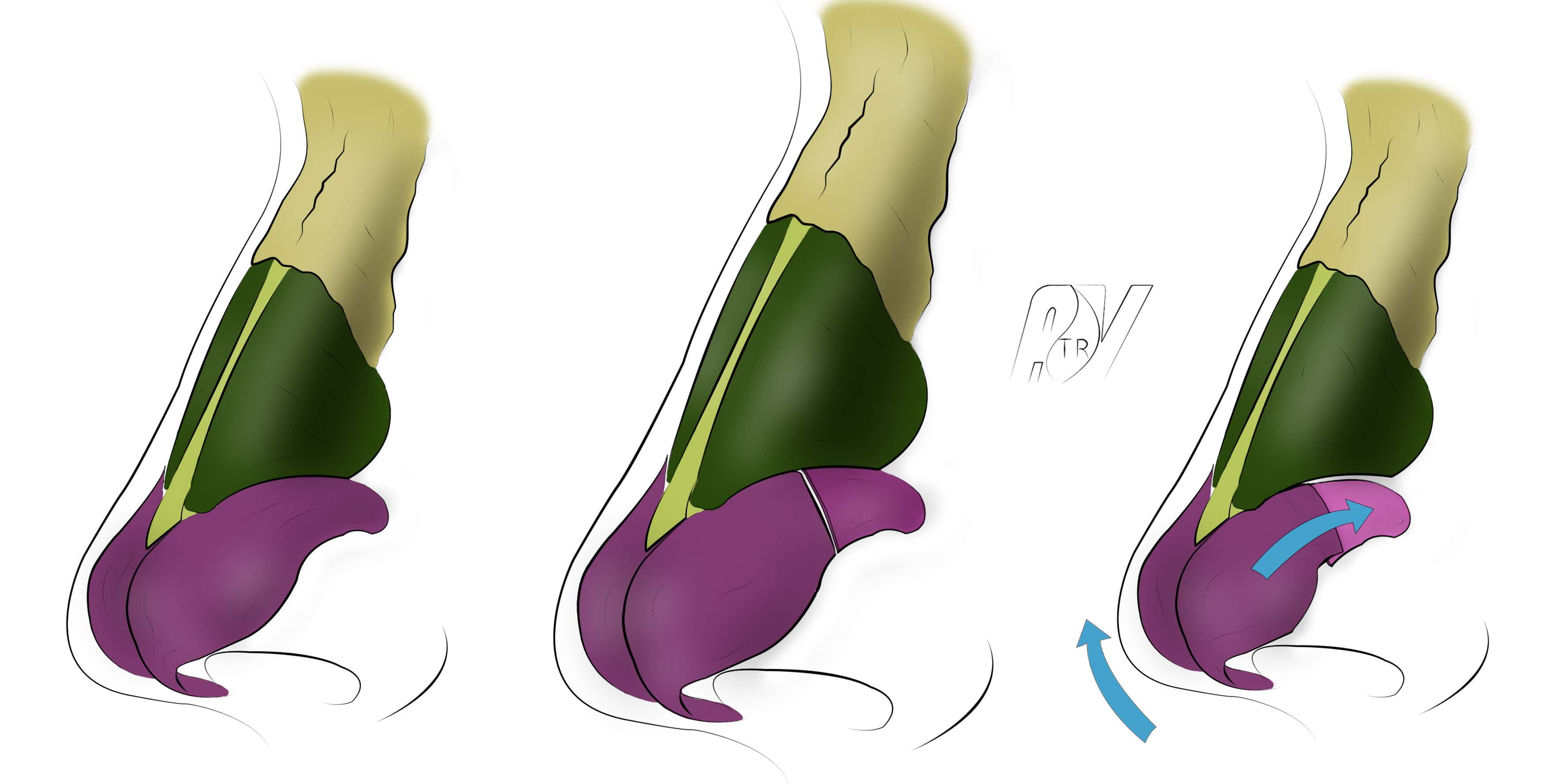 Les voies dissimulées (trans- et intercartilagineuses) permettent de respecter l’infrastructure des alaires, la région du dôme et leurs connections cutanées. La peau du triangle inférieur du lobule et du bord narinaire, à partir du triangle mou garde sa situation et son modèle initial. Il s’agit là d’un point particulièrement important pour conférer à la pointe du nez une forme naturelle et conforme aux critères esthétiques recherchés.