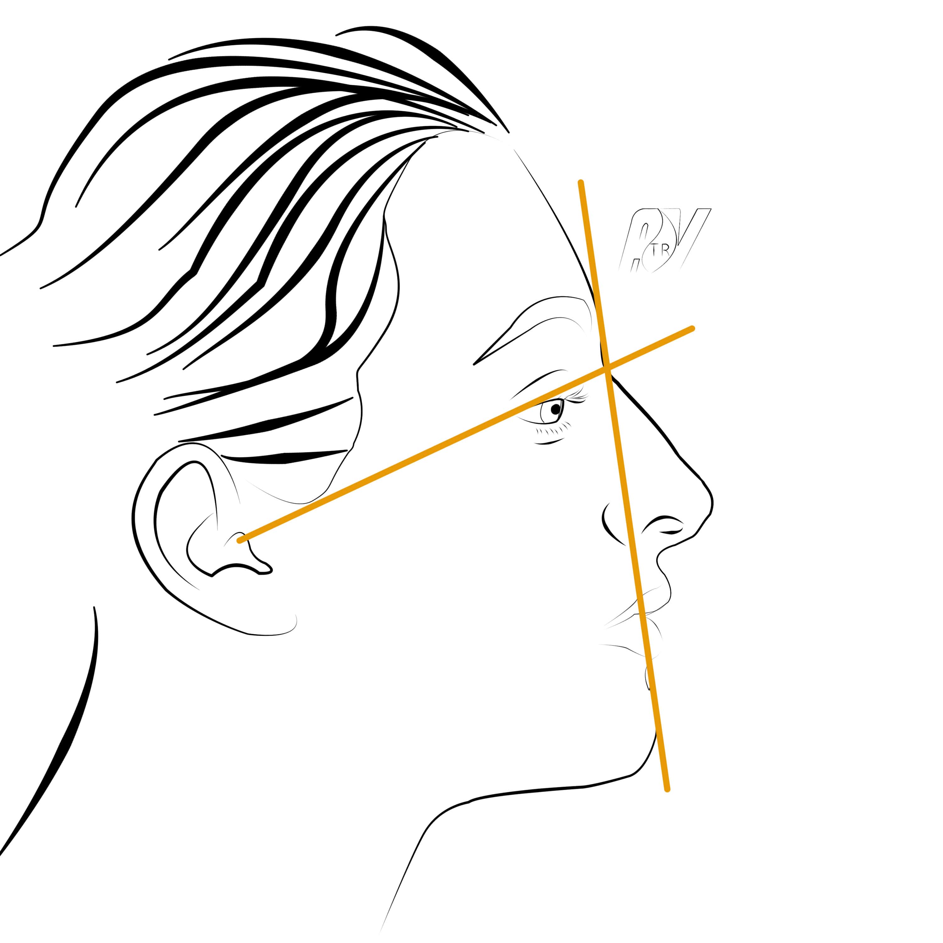 La position idéale de l’angle naso-frontal peut être défini par le tracé de la ligne reliant le rebord supérieur du conduit auditif externe au cathus externe et la ligne du plan facial (tangente au front et à la lèvre supérieur (bien positionnée). L’angle doit se situer sur la ligne CAE / Canthus au croisement ou jusqu’à 5 mm en retrait avec le plan facial.