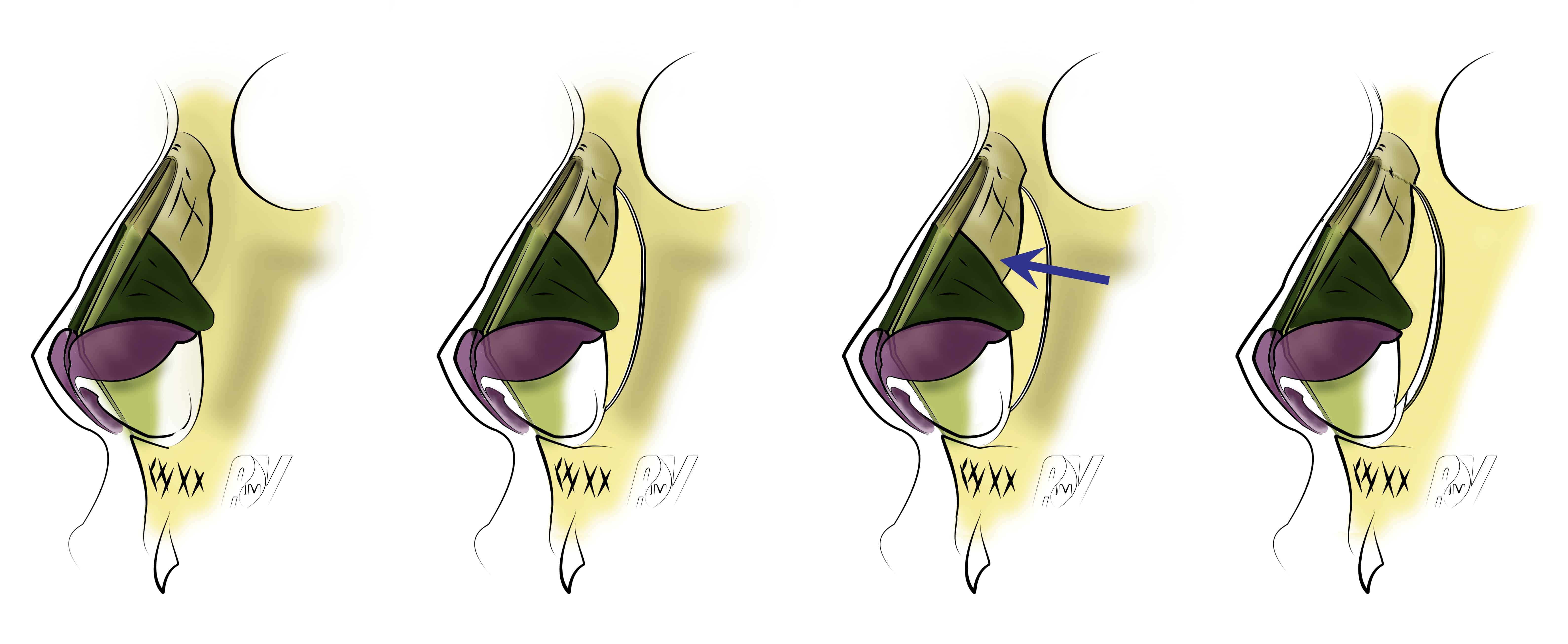 Avant la section la muqueuse invaginée dans le dièdre osseux doit être dégagée par une technique extra-muqueuse large. Le nez fixe est exposé par une incison inter-septo-columellaire, le nez osseux ruginé sur la zone d’exérèse projetée de la bosse, l’excédent du bord caudal du septum éventuel est enlevé. La pointe positionnée par le racourcissement des CLS et par la correction de la pointe. On peut tracer le repère cutané de la section de la bosse. Il faut pratiquer une extramuqueuse du dièdre ostéo-cartilagineux supérieur. Ce temps peut être effectué sous optique. Les CLS sont sectionnés de leur attache septale (dysjonction septo-triangulaire). La muqueuse est disséquée sur leur face inférieure et sur le versant septal correspondant puis ruginé sous l’auvent des os propres. Elle peut alors être refoulée vers le bas. Une tuile placée sous les téguments expose les bords dorsaux du septum et des 2 CLS. Ils sont sectionnés au bistouri ou aux ciseaux de Cottle fin selon le repère cutané. L’utilisation de l’endoscope peut être d’une grande aide pour ce temps. Il est également possible de réséquer le bord supérieur du septum nasal et les parties médianes ds 2 CLS grâce à un bistouri froid. On sectionne ainsi la bosse cartilagineuse en monobloc.