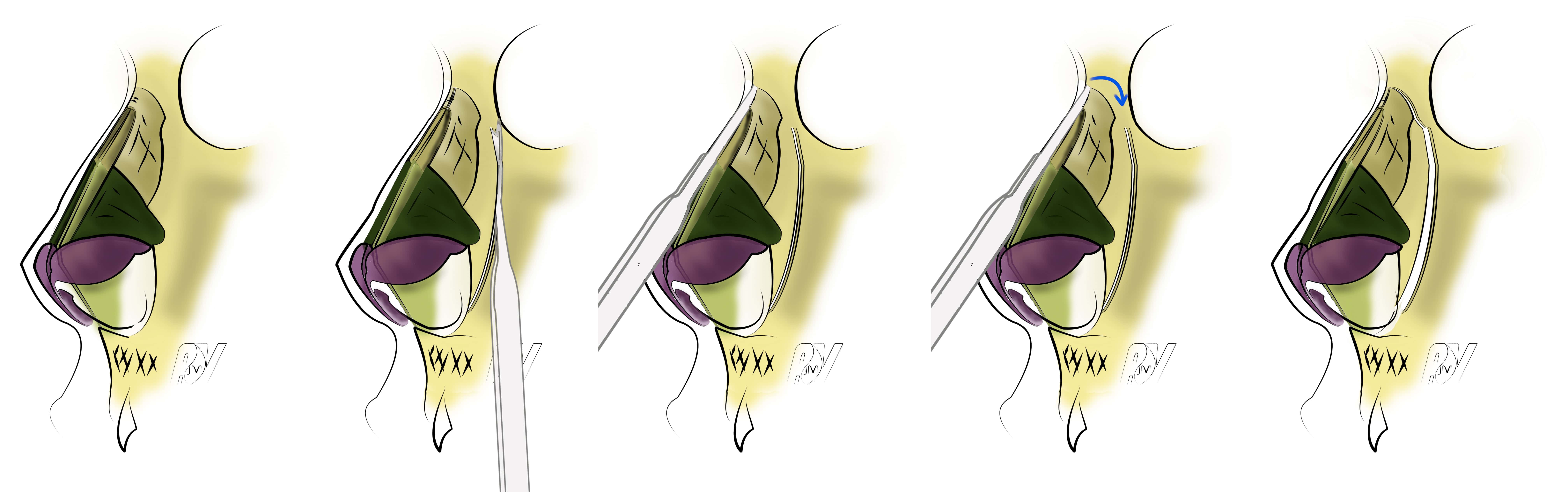 Cette technique peut être étendue en haut à l’angle naso-frontal afin de permettre son creusement lorsque la cyphose haute est associé à un comblement de cet angle.