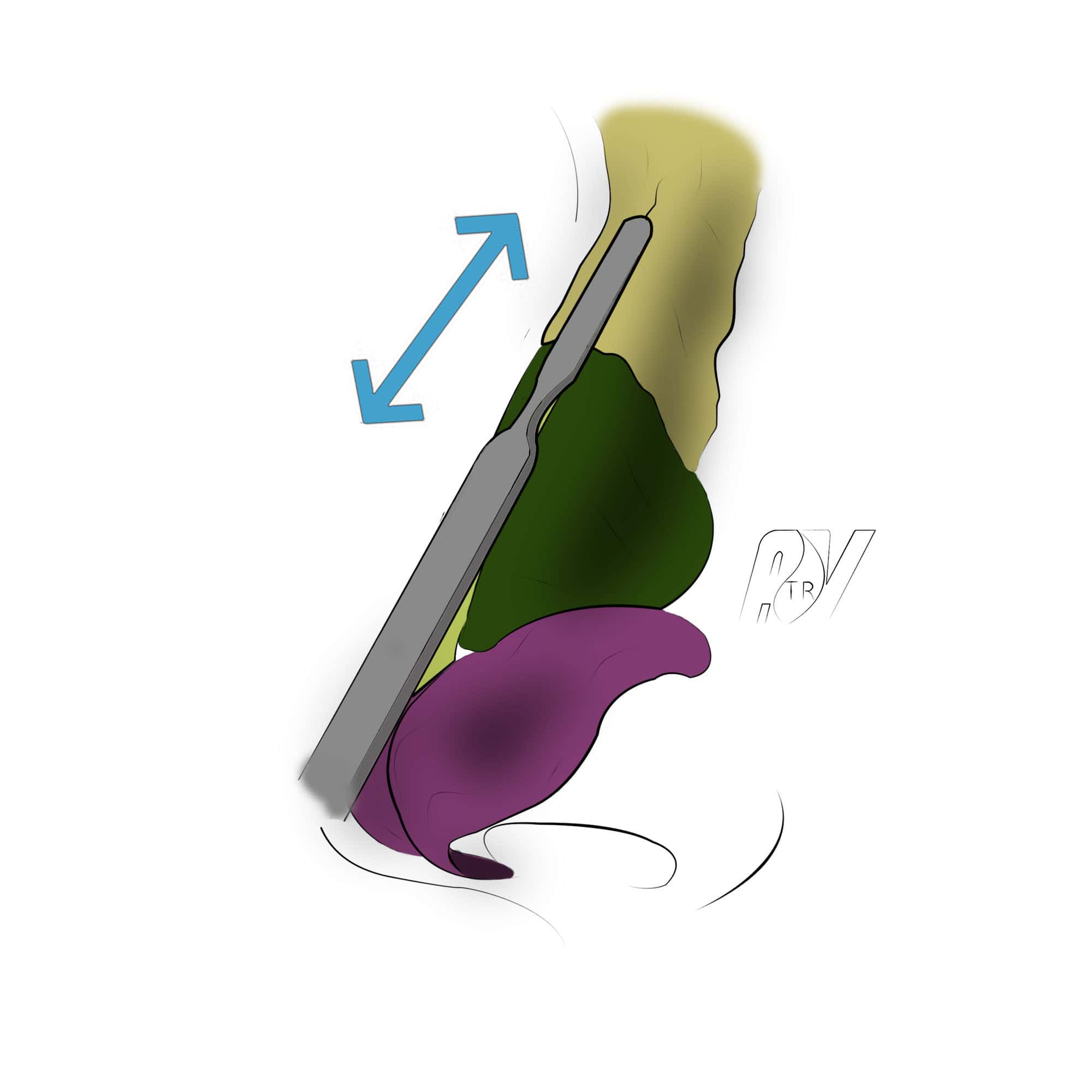 Elle doit être prolongée en bas et en arrière, afin de permettre une dissection précise le long du bord caudal de la cloison et de l’épine nasale.